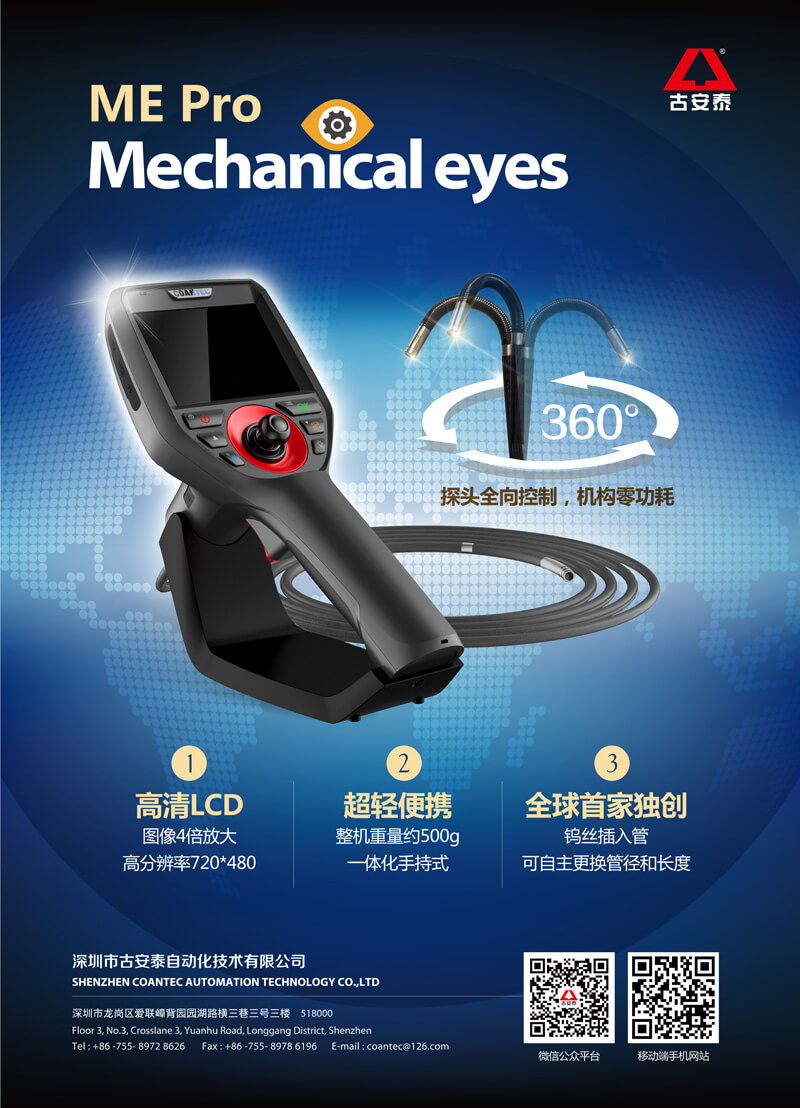“ME Pro”系列內窺鏡是我司經過多年精心研究,吸收國內外先進技術,自主創新研發的一款便攜易用360°任意導向、可更換管線的工業視頻內窺鏡。“ME Pro”采用用一體化設計,輕巧便攜,高清圖像傳感技術,圖像更清晰。集耗材、、工具化、輕量化、功能化、集成化、一體化等特點為一體,將高端檢測儀器變身為便攜檢測工具,縮短了汽修檢測及維修的時間和成本,可視化直觀檢測大大提高了業務水平和服務,并且增強了用戶體驗和信任。汽車內窺鏡勢必成為汽車后市場發展不可或缺的工具。